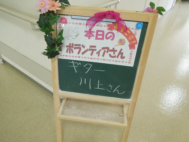 同席になった川上さんという方から、翌週、2階のデイサービスでギターの演奏をするという情報をキャッチ。